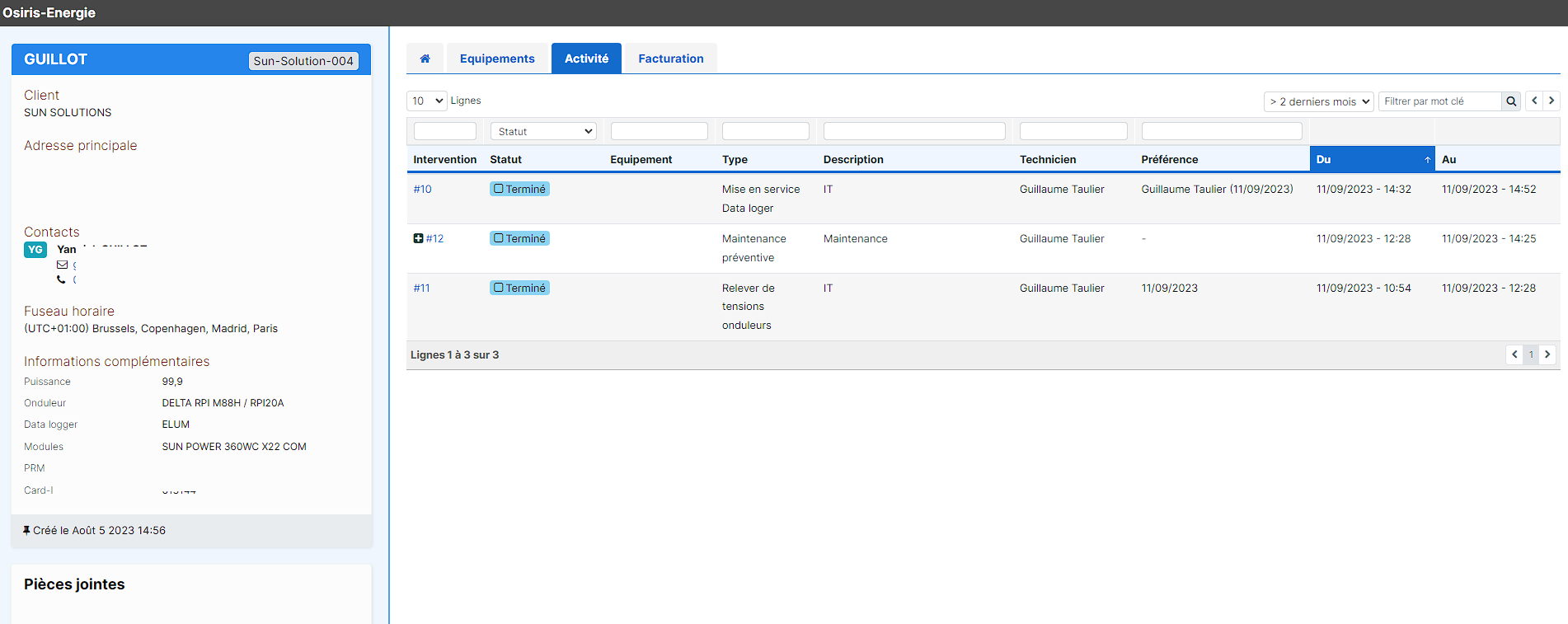 Le nombre d'interventions réalisé sur vos centrales et les factures liées
